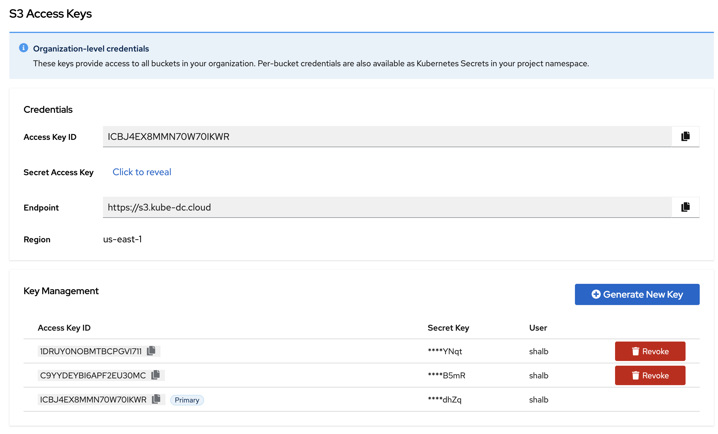 These keys provide access to all buckets across all projects in your organization. Manage them from the Access Keys section.