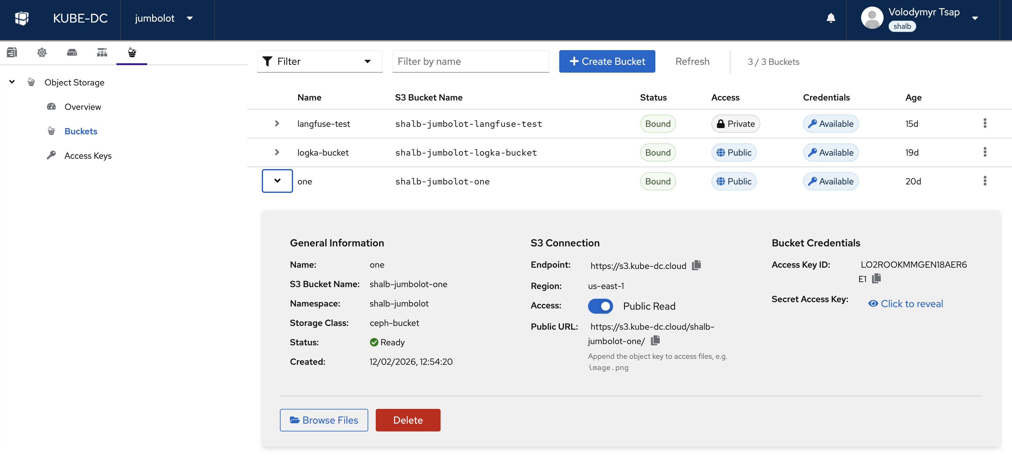Kube-DC provides S3-compatible object storage for storing files, images, backups, and any unstructured data. You can manage buckets and files through the dashboard or use standard S3 tools like AWS CLI, s3cmd, and boto3.