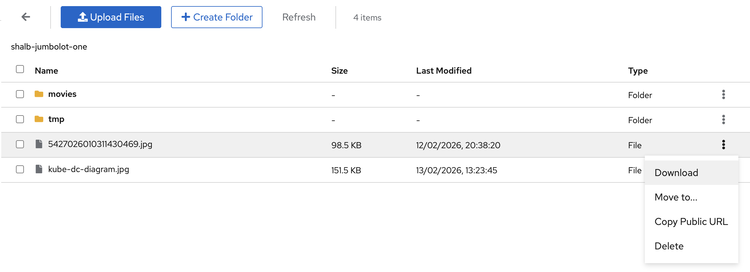 The built-in file browser lets you manage objects directly from the dashboard without any external tools.